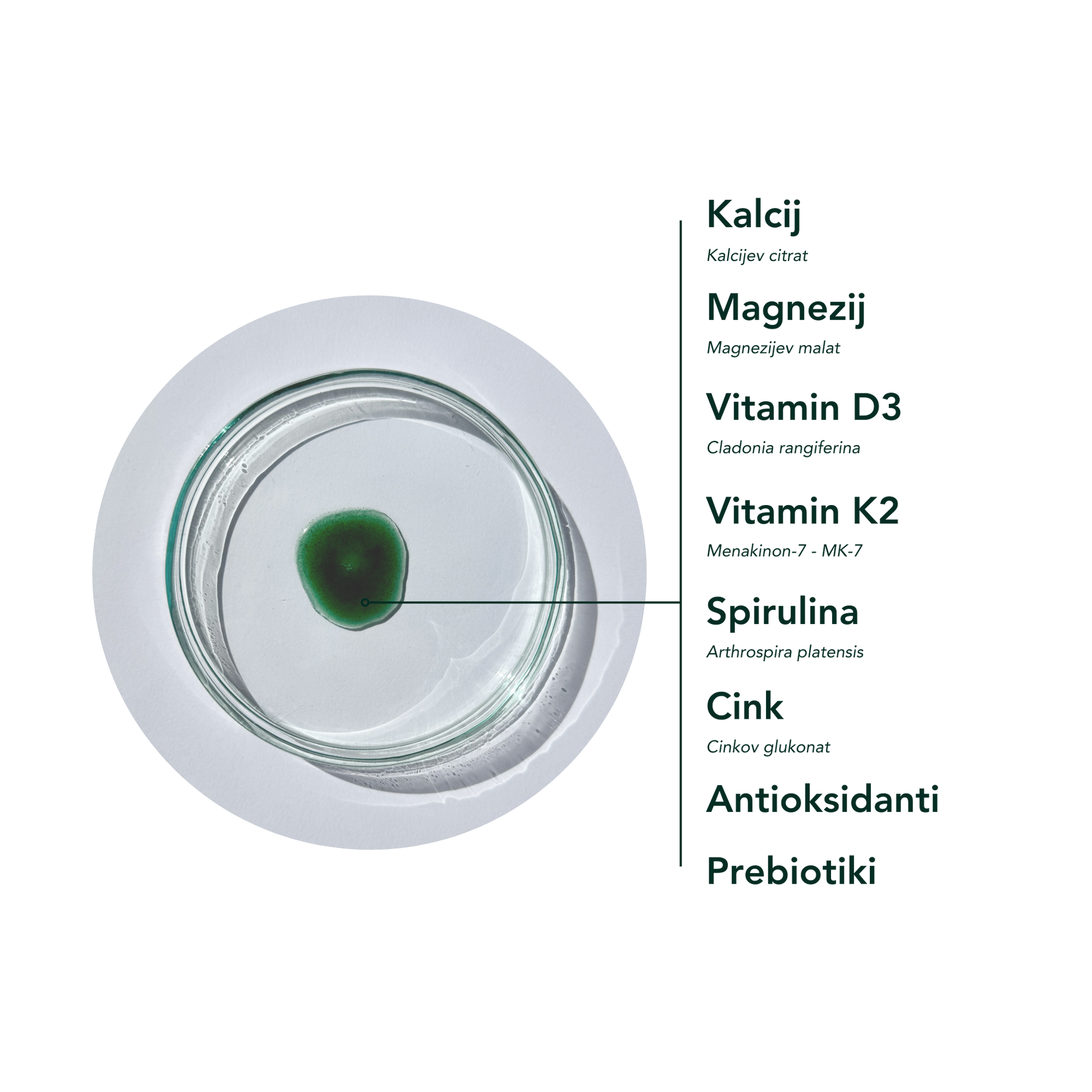 Naša formula je bila skrbno zasnovana na način, da vsaka aktivna sestavina v njej igra točno določeno vlogo v procesu izgradnje kostnega tkiva. Tako skupaj tvorijo sinergetično celoto, ki z eno žličko nadomesti več kot pet prehranskih dodatkov.